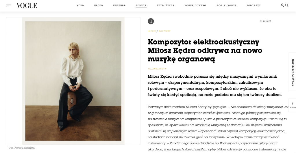 “Miłosz Kędra swobodnie porusza się między muzycznymi wymiarami: solowym – eksperymentalnym, kompozytorskim, zakulisowym i performatywnym – oraz zespołowym. I choć nie wyklucza, że oba te światy się kiedyś spotkają, na razie podoba mu się ten twórczy dualizm.”